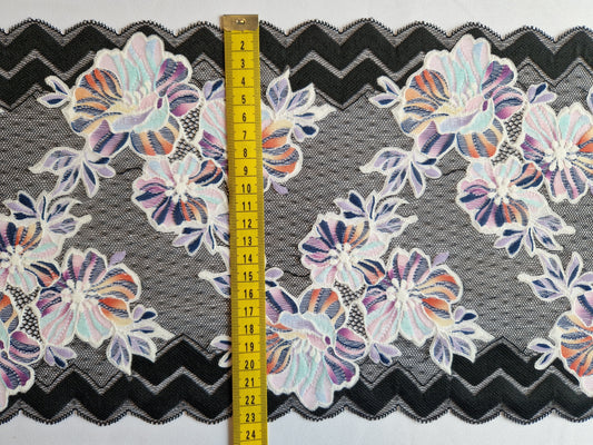 Melkwit stretchkant met zwart omlijnde bloemen