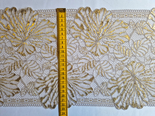 2025-103 super zacht beige stretchkant met kleine bloemetjes in broderie stijl voorzien van goudkleurig lurexdraad