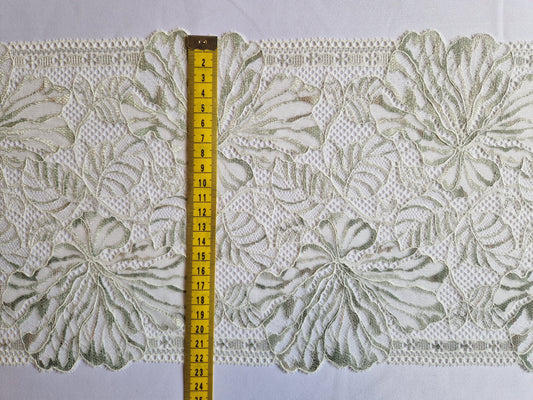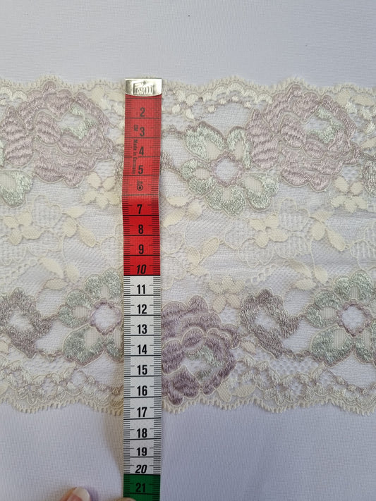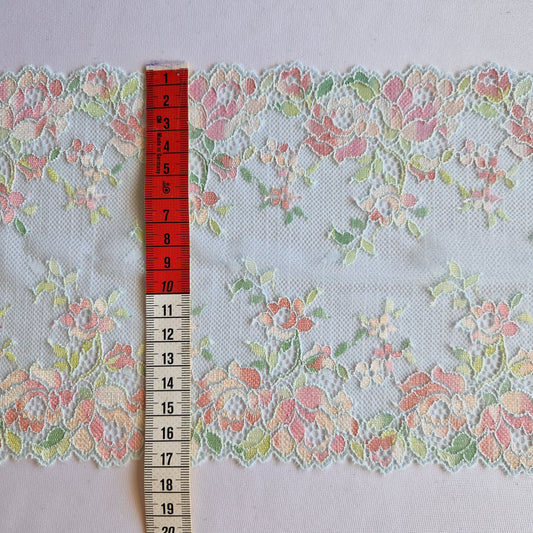 Ivoor stretchkant met ingeweven rozen in zacht vintage roze en groen