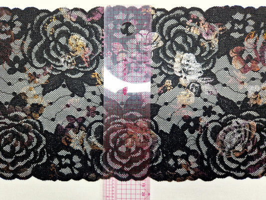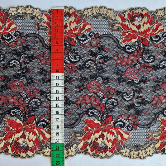 2025-42 gebreid zwart stretchkant met rozen in rood en zand