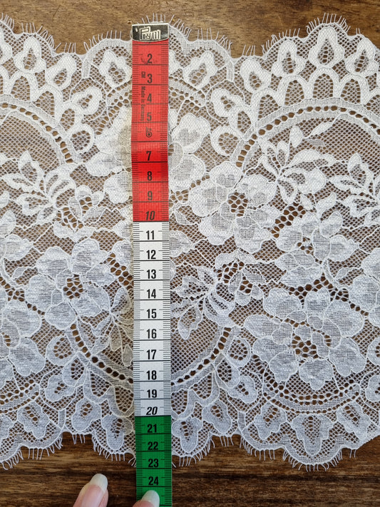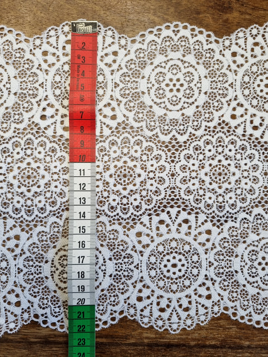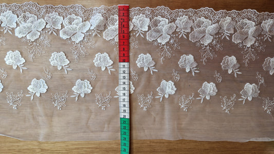 2024-153 rekbaar, wit, geborduurd tulekant; prachtig iriserend door zeepbel kleurig lurex draad