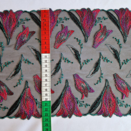 2024-124 Antraciet stretchkant met vrolijke, gespiegelde bloemenprint
