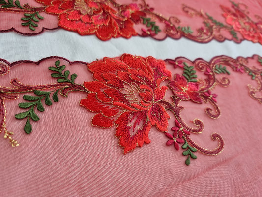 Beige tule kant met geborduurde bordeaux met witte roosjes