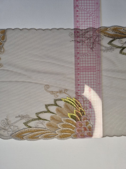 Grijs tule kant met geborduurde vogelvleugels met groen lurex draadje