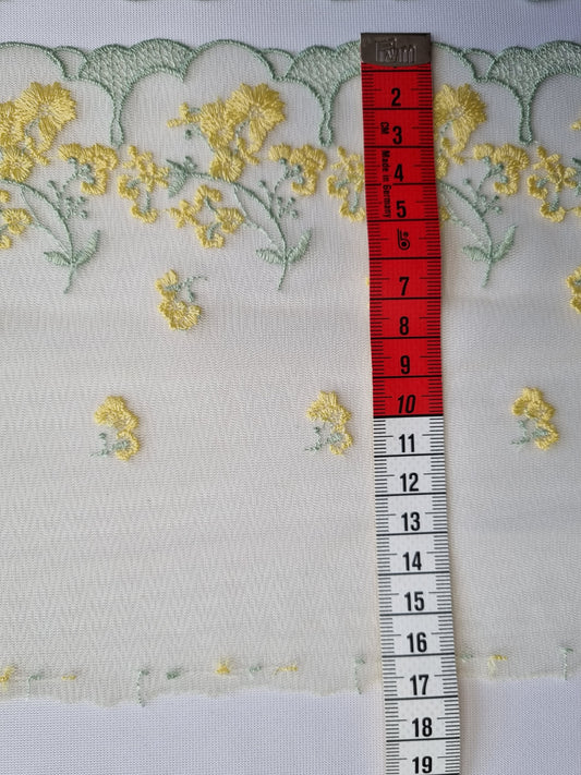Licht geel tule kant met licht geel geborduurde, kleine bloemetjes