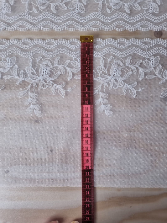 Lavedelblauw tule kant met wit en lavendel geborduurde bloemen