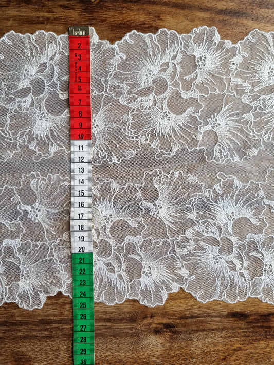 Zeer fijntjes geborduurd tule kant.