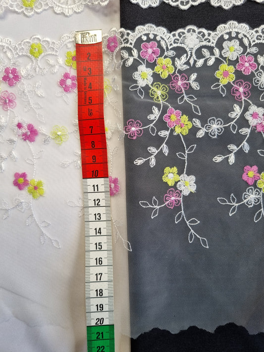 Wit tule kant met kleine geborduurde bloemetjes in wit, fuchsia en lime.