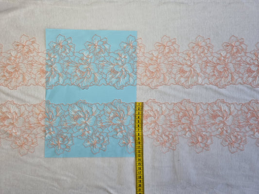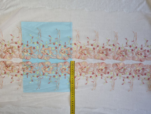 Wit tule kant met peach kleurig bloemen borduursel.