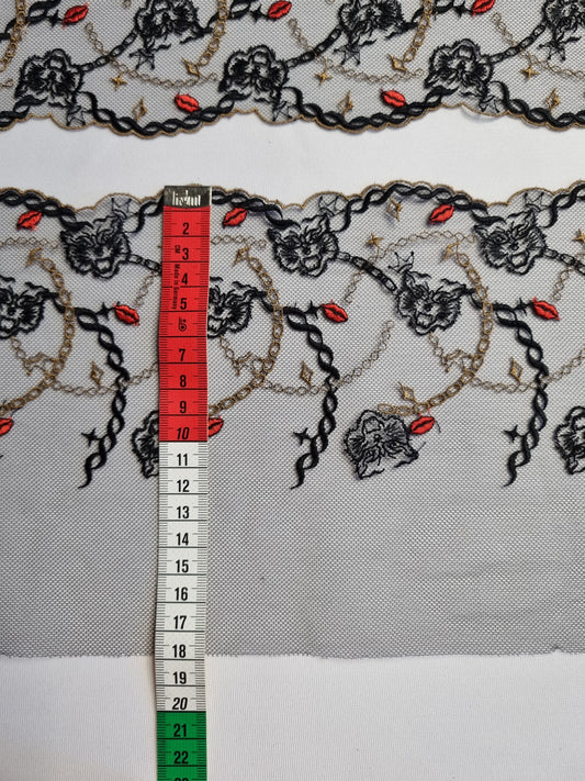 Zwart tule kant met blauwe geborduurde bloemen en goudkleurige lurex draad.