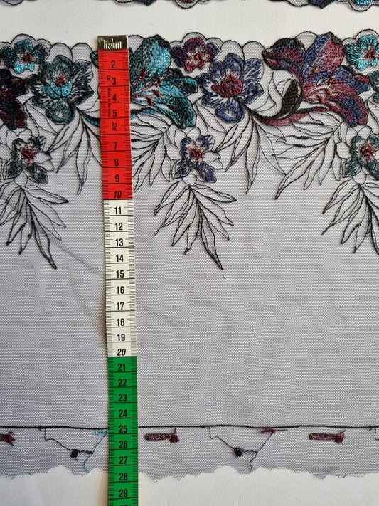 Zwart tule kant met geborduurde lelies in aubergine en turquoise