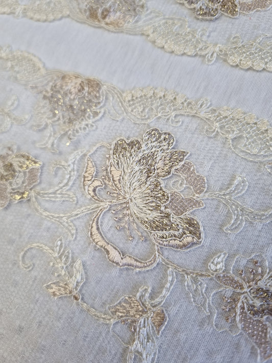 Zeer sjiek crème kleurig tule kant met geborduurde rozen.