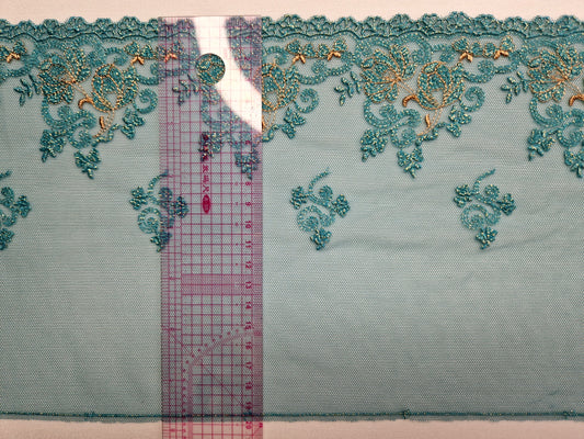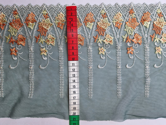 2024-148 emerald groen tule kant met gotisch, gebloemd borduursel in oranje en geel