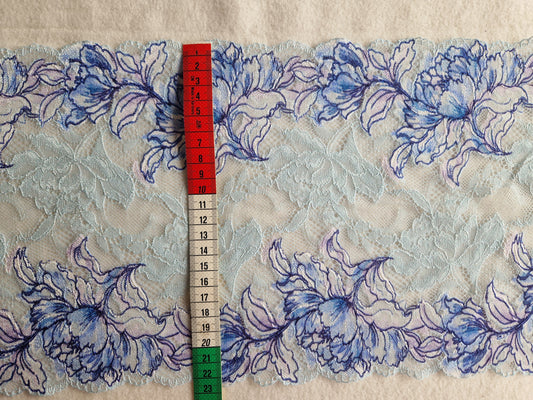 2024-139 lichtblauw stretchkant met gespiegelde bloemenprint