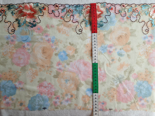 2024-138 35cm breed zacht geel tule kant met print en geborduurde rozen met goudkleurig lurex draadje