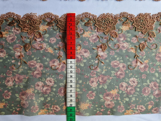 2024-149 olijfgroen tule kant met vintage rozenprint en camel bruine, geborduurde rozen,