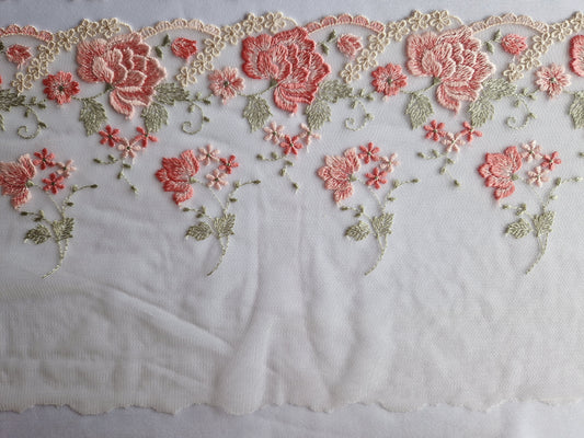 2024-142 Wit tule kant met klassiek roze geborduurde roosjes