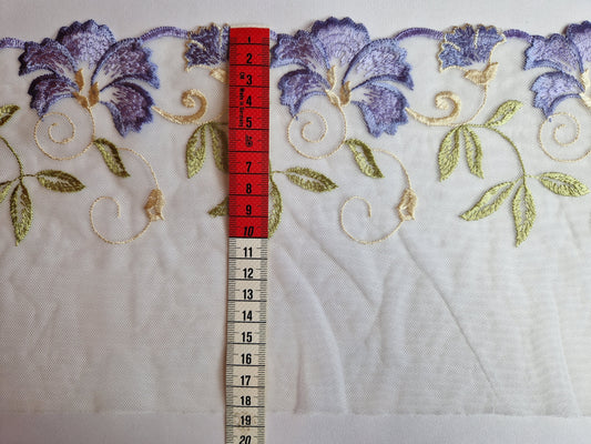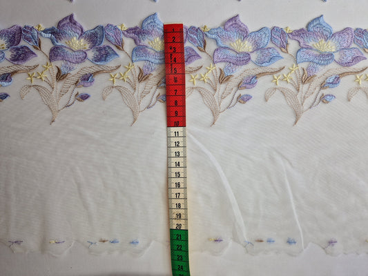 2024-143 Wit tule kant met lavendel paarse, geborduurde lelies