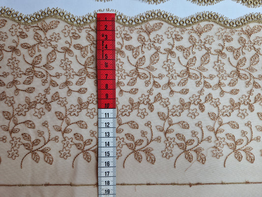 2024-145 camel kleurig tule kant met geborduurde bloemetjes rijkelijk voorzien van goudkleurig lurex draad