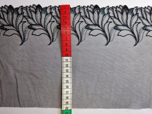 2024-146 Zwart tule kant met abstract geborduurde blaadjes voorzien van lichtblauw lurex draad