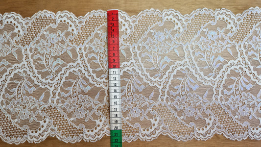 2024-153 rekbaar, wit, geborduurd tulekant; prachtig iriserend door zeepbel kleurig lurex draad