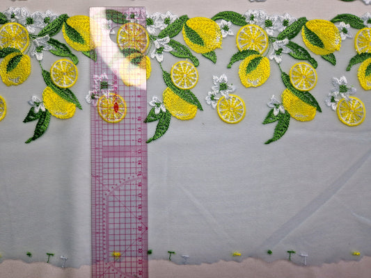 2024-2 lichtblauw tule kant met knal gele citroenen.