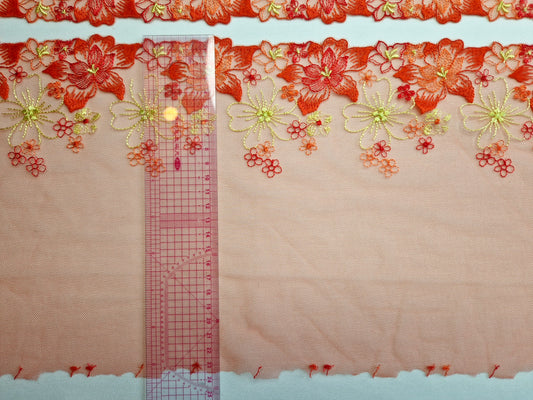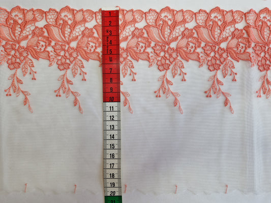 2024-155 wit tule kant met pastelkoraal bloemenborduursel