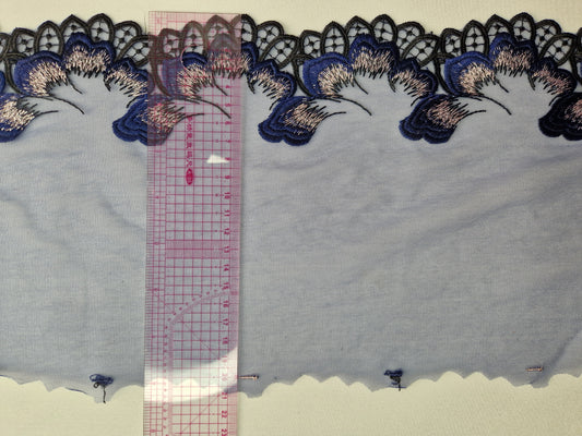 2024-18 Dusty paars lavendel tule kant met zeer fijn geborduurde barokke rand in blauw