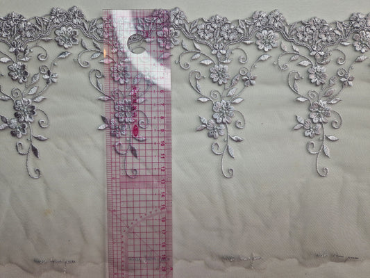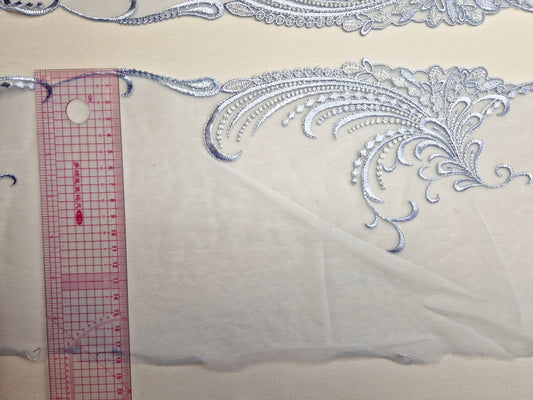2024-23 licht lavendelblauw tule kant met barok borduursel en zilverkleurig lurex draadje
