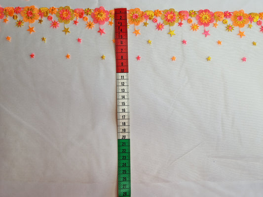2024-154 creme tulekant met geborduurde bloemetjes en sterretjes in neon roze, oranje en goudgeel