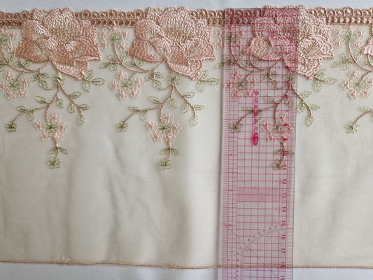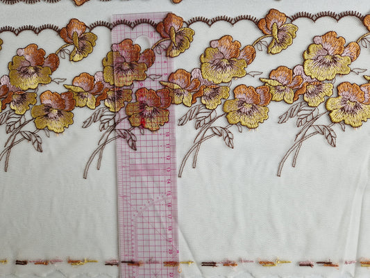 2024-40 ecru tule kant met bloemen in zacht geel en taupe.