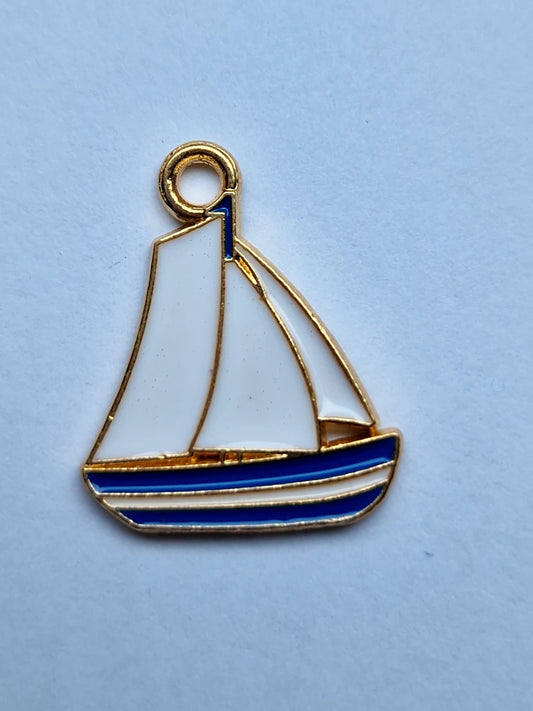 goudkleurig bedeltje van zeilboot, emaille ingelegd met blauw en wit