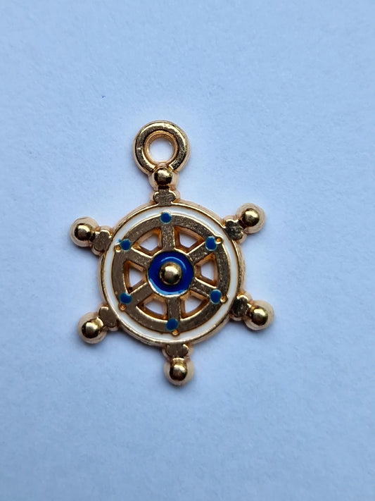 Licht rose goud kleurig bedeltje van een scheepswiel, emaille ingelegd met blauw en wit