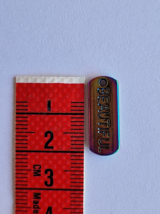 Bedeltje in regenboogkleuren met de tekst BEAUTIFUL