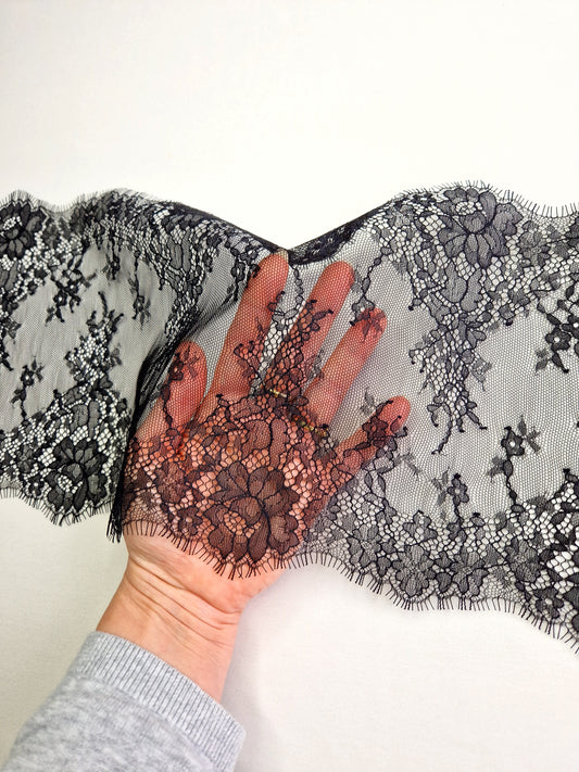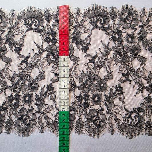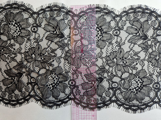 2024-65 zwart Frans wimperkant met groot boeket motief