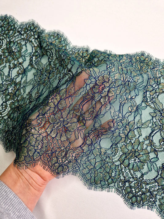 2024-29 fraai Frans wimperkant in donkergroen met goudkleurig lurex draadje