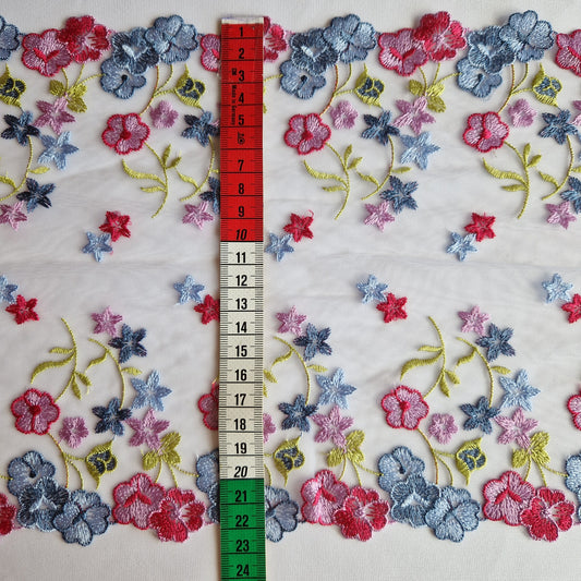 2025-34 licht grijs tule kant met bloemetjes rozerood, lila en blauw