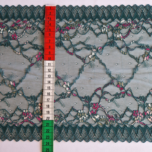 2025-41 petrol groen stretchkant met barok design en multi color details.
