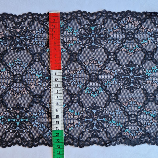 2025-43 gebreid zwart stretchkant met geometrisch bloemetjes design in multi color