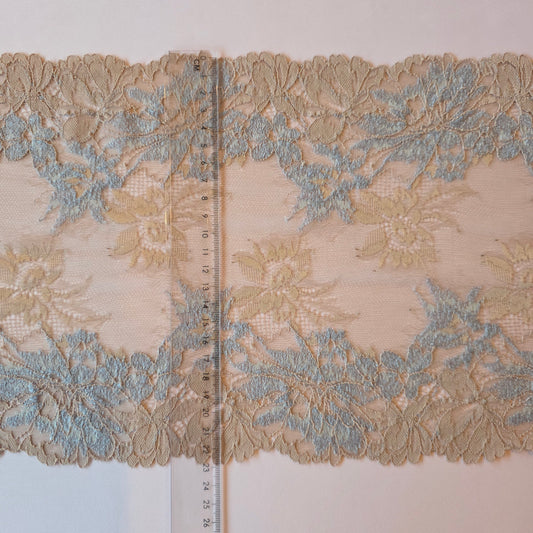 2026-8 taupe stretchkant met lavendelblauwe bloemen