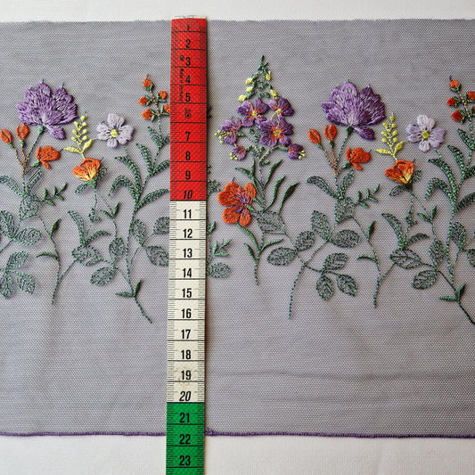 2025-80 donker paars tule kant met kleurrijke wilde bloemen