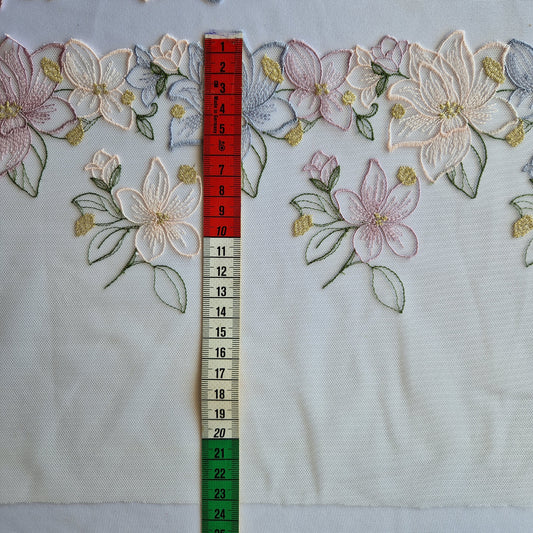 2025-49 wit tule kant met lelies in pastelkleuren voorzien van goudkleurig lurex draad