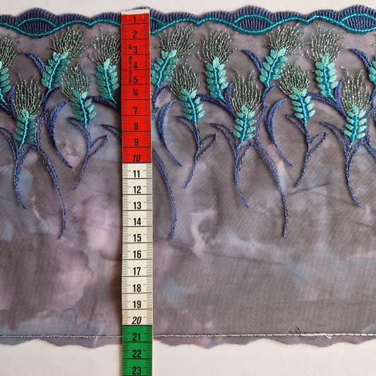 2025-60 donkerblauw tulekant met print, geborduurd graan voorzien van zilverkleurig lurex draad en blauwe pailletten