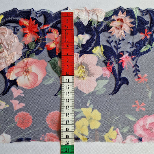 2025-62 marineblauw tule kant met kleurrijke bloemenprint en botanisch borduursel voorzien van iriserend lurex draad