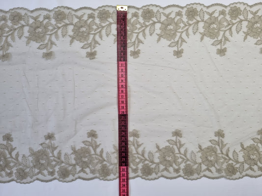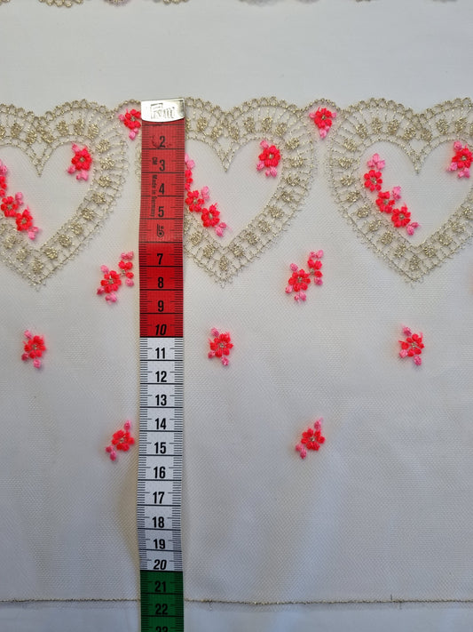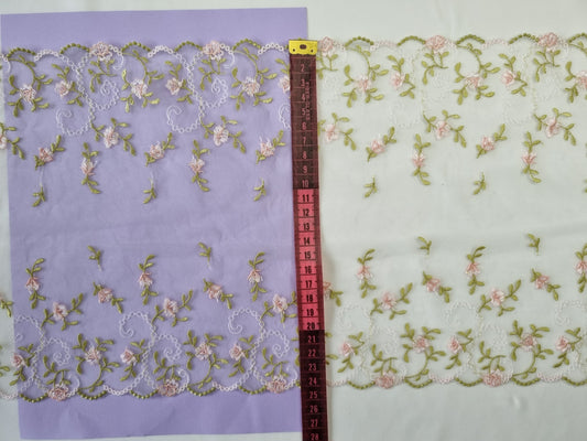 Rijkelijk geborduurd wit tule kant met kleine roze roosjes