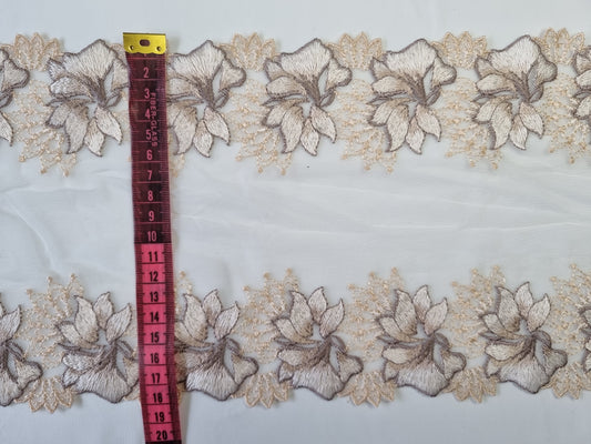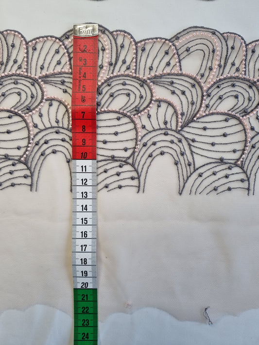 Perzik kleurig tule kant met abstract lichtgrijs borduursel