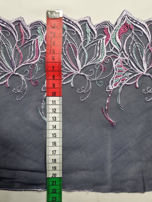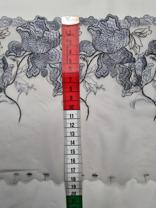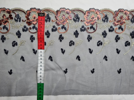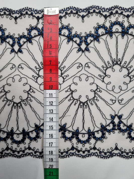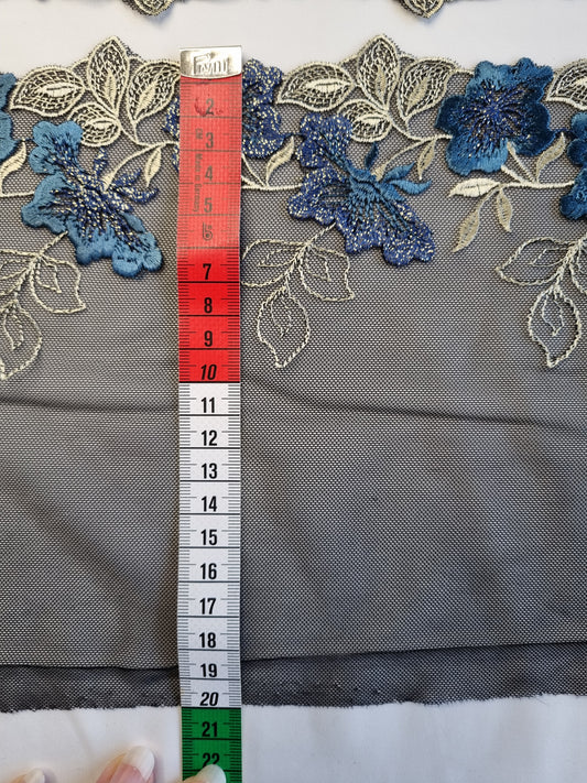 Zwart tule kant met blauwe geborduurde bloemen en goudkleurige lurex draad.
