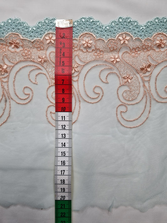 Lichtblauw tule kant met kleine bloemetjes in perzik