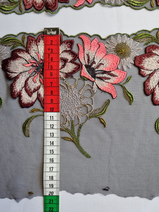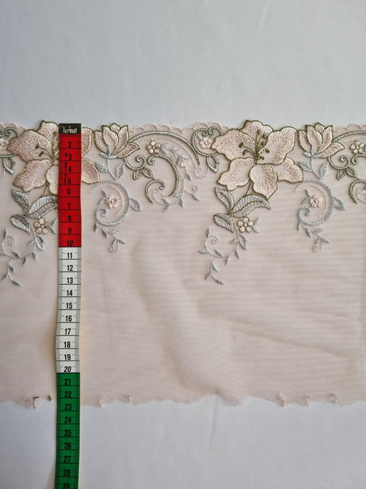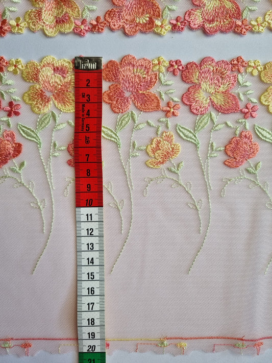 Peach kleurig tule kant met peach en zacht geel geborduurde roosjes
