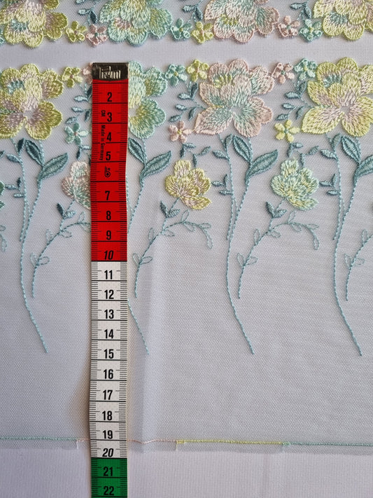 Mint kleurig tule kant met licht roze, mint en zacht geel geborduurde roosjes
